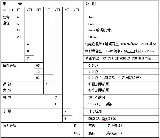 例如,选用一台法兰连接式防爆型涡轮流量计测量柴油,管道为DN40、现场需要显示并远传电流信号,要求精度0.5级,304不锈钢材质,仪表耐压16MPa测量范围为标准量程,其产品型号应为:LT-304-40(FL)/C/05/S/S/E/H16。